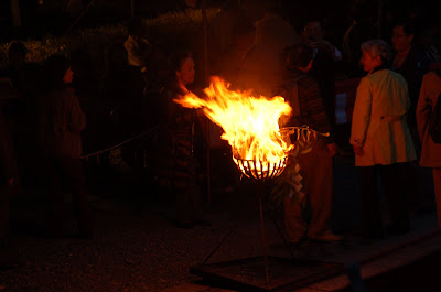 集落各所に焚かれたかがり火の中を、氏子が松明を持って練り歩いて神社山門を目指す。